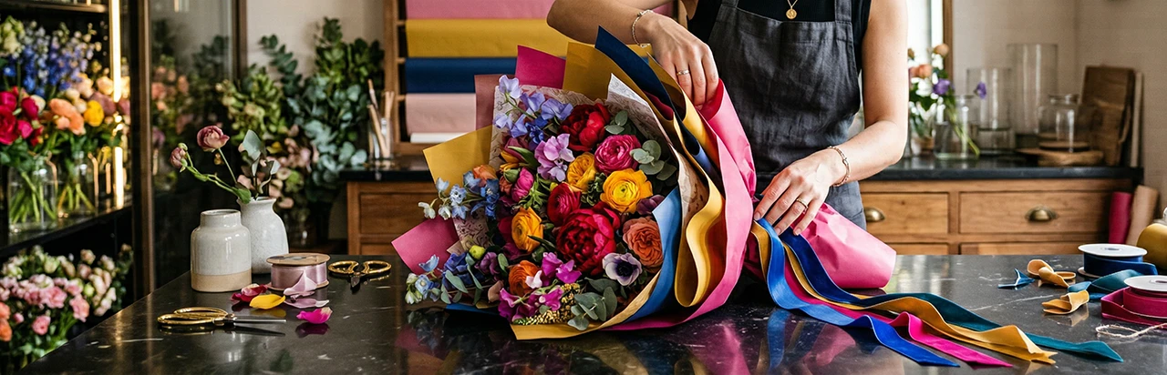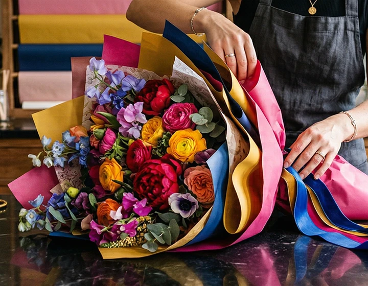 Сезонность. Весенние букеты (тюльпаны, нарциссы) оформляйте в легкую пастельную бумагу или сетку. Летние (пионы, ромашки) — в крафт или яркую тишью. Осенние (хризантемы, георгины) — в бумагу теплых оттенков (терракотовый, горчичный). Зимние (розы, эустомы) — в металлизированную или бархатную упаковку.