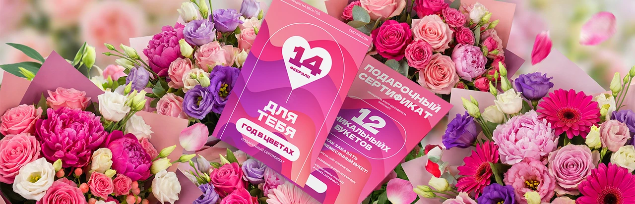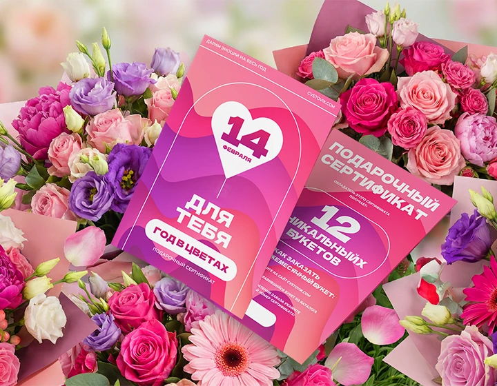В честь 14 февраля мы дарим не просто букет, а цветы на весь год. «Цветовик» разыгрывает сертификат на 30 000 ₽ на Цветочную подписку среди покупателей букетов.
