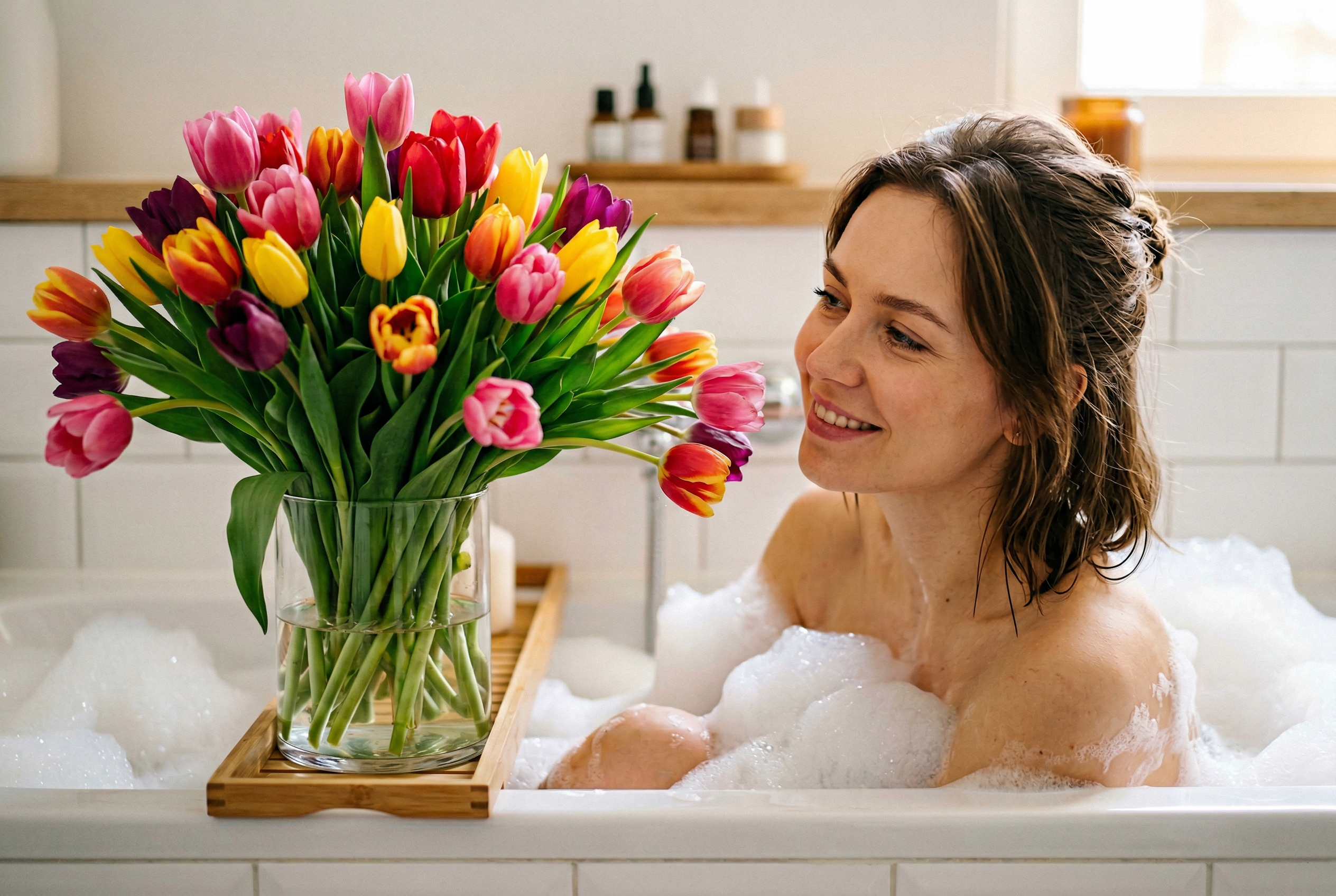 Мы привыкли, что цветы дарят. Но тюльпаны себе — это отличная практика. Купить букет просто так, в среду, без повода. Поставить на стол. Смотреть.