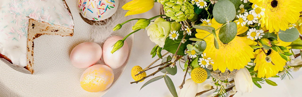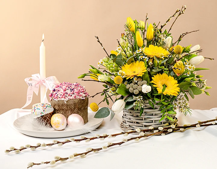 Цветы дают ощущение весны. Для Пасхи хорошо подходят тюльпаны, нарциссы, гиацинты и ветки зелени. Если в доме жарко, выбирайте устойчивые сорта и ставьте их подальше от батарей.
