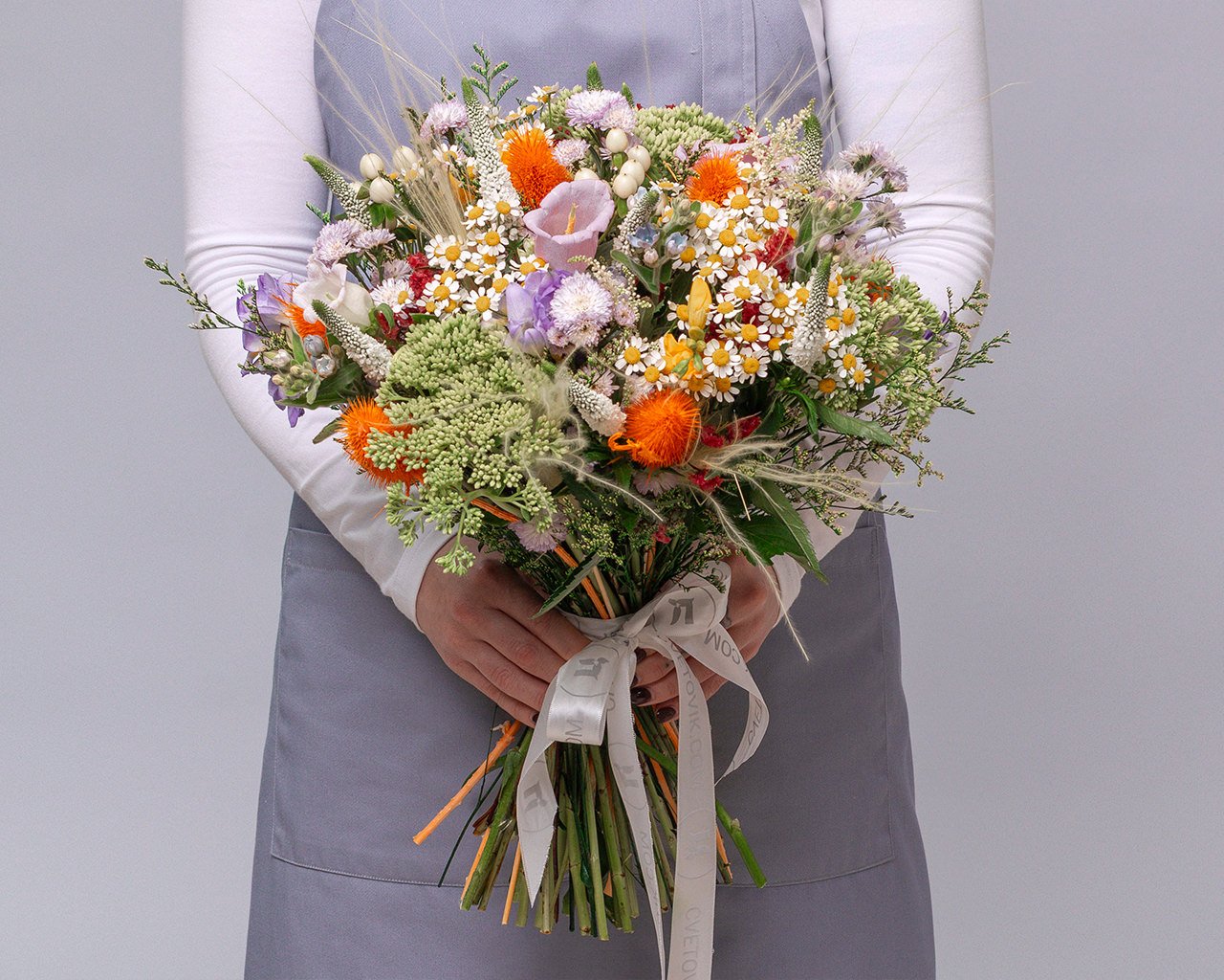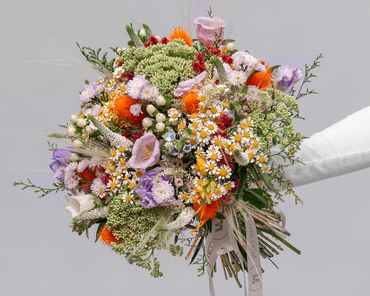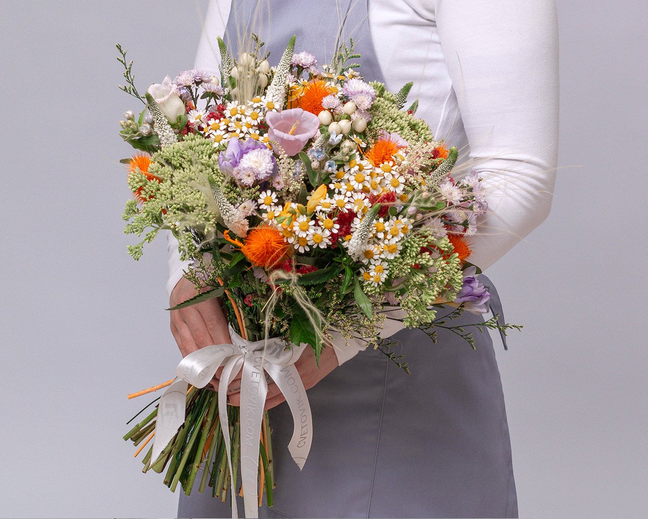 Состав: седум 3 шт., вероника 7 шт., астильба 5 шт., матрикария 6 шт., кампанула 5 шт., фрезия 5 шт., хиперикум 5 шт., твидия 5 шт., астра 5 шт., лимониум 4 шт., ковыль 0,5 шт., ворсянка 0,6 шт., сухоцвет 0,3 шт., лента 3 шт.