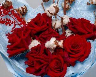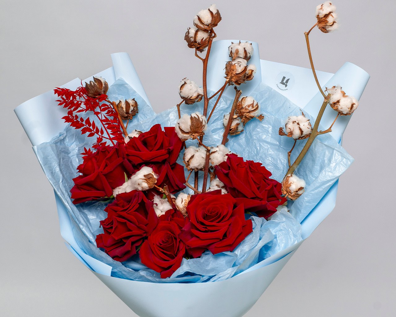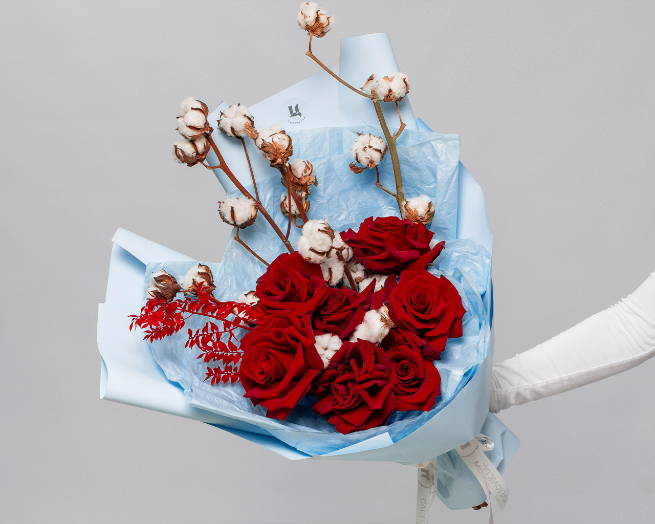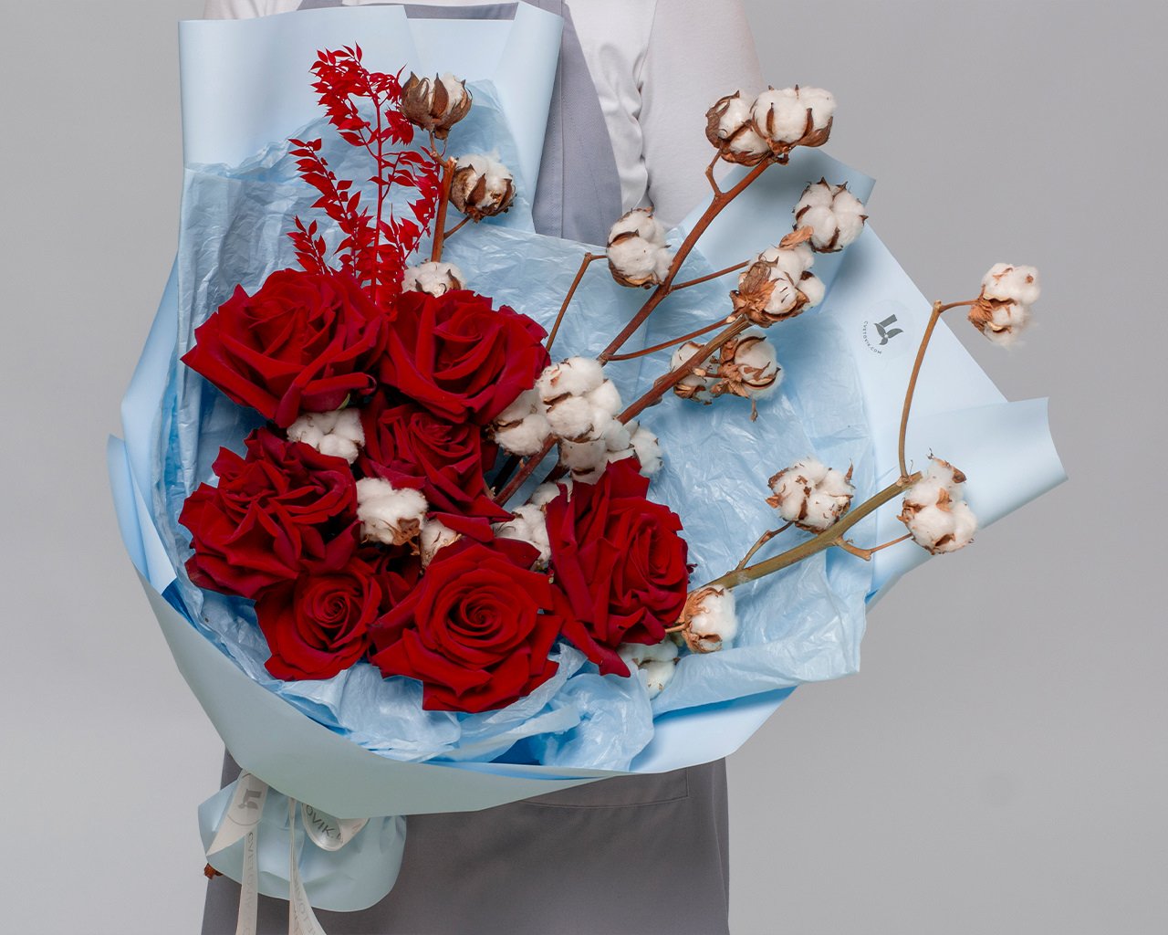 Состав: роза Премиум 40-50 см 7 шт., хлопок 4 шт., рускус стабл. 1 шт., тишью 3 шт., пленка 2 шт., лента 1 шт.
