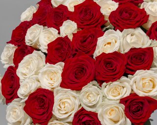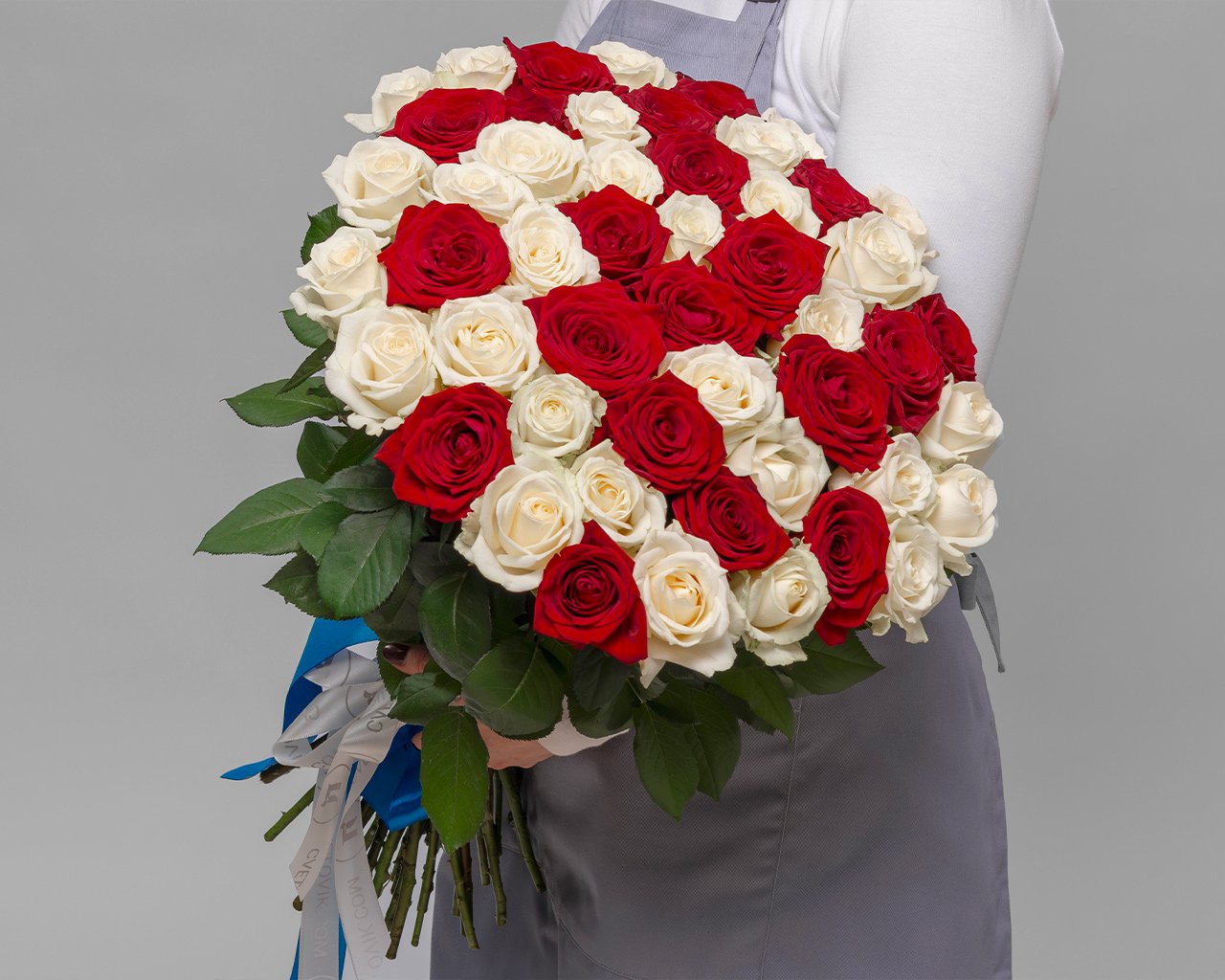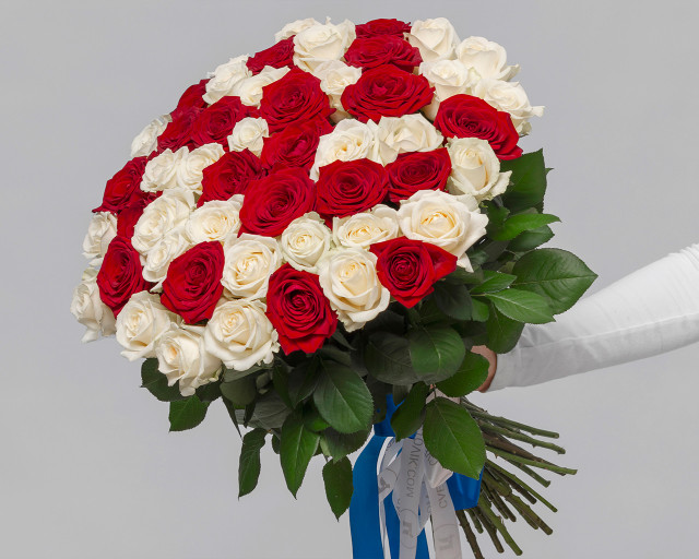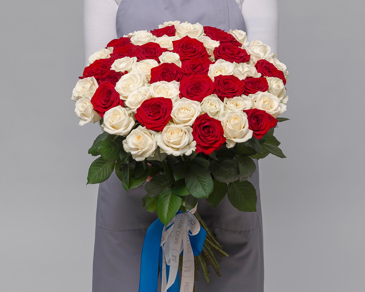Букет из 51 красной и белой розы 35-40 см (Россия) под ленту