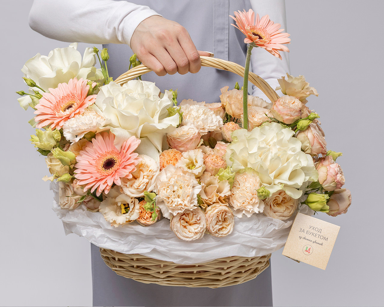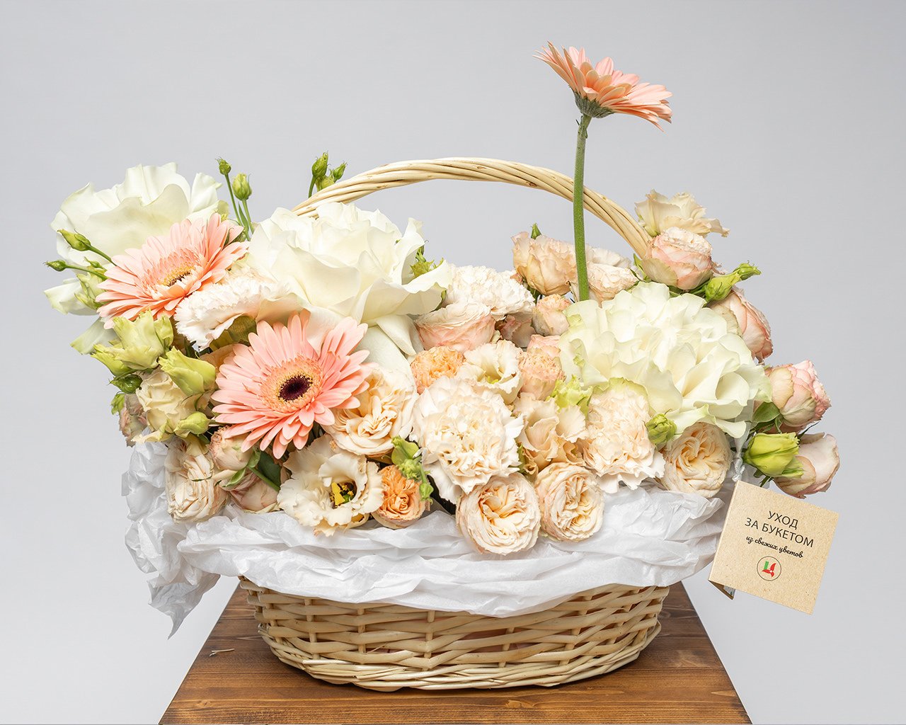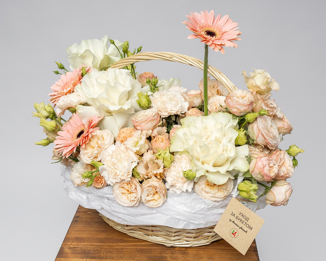 Состав: гербера стандарт 3 шт., роза Эквадор 40-50 см 5 шт., гвоздика 7 шт., эустома 5 шт., садовая роза куст. 5 шт., корзина 1 шт., оазис 1,5 шт., тишью 1 шт.