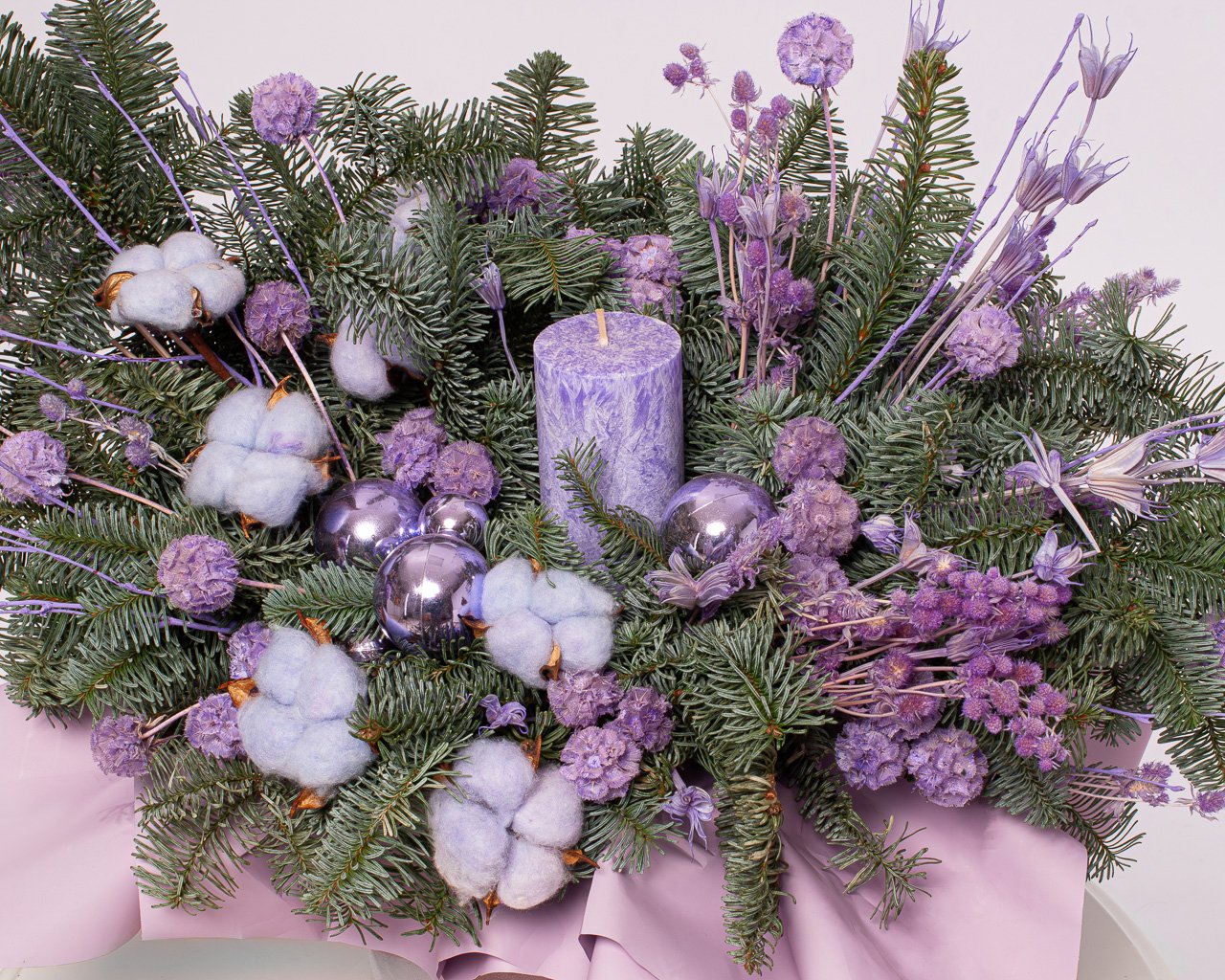 Композиция Новогодняя улыбка сделана в нежно-лиловых тонах, используются милые игрушки. Данная композиция подарит теплые эмоции и покажет ваше трепетное отношение.