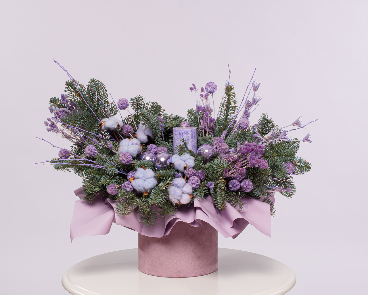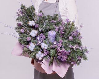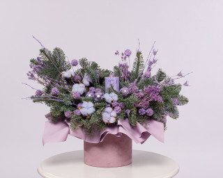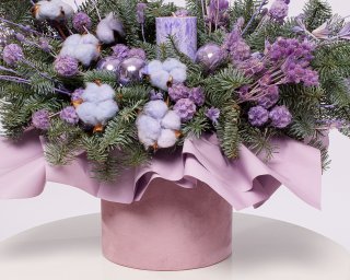 Композиция Новогодняя улыбка сделана в нежно-лиловых тонах, используются милые игрушки. Данная композиция подарит теплые эмоции и покажет ваше трепетное отношение.