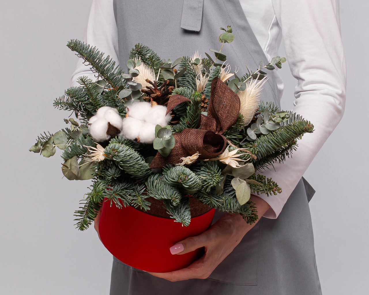 Состав: нобилис, новогодний декор, коробка, оазис.