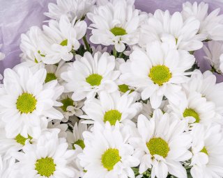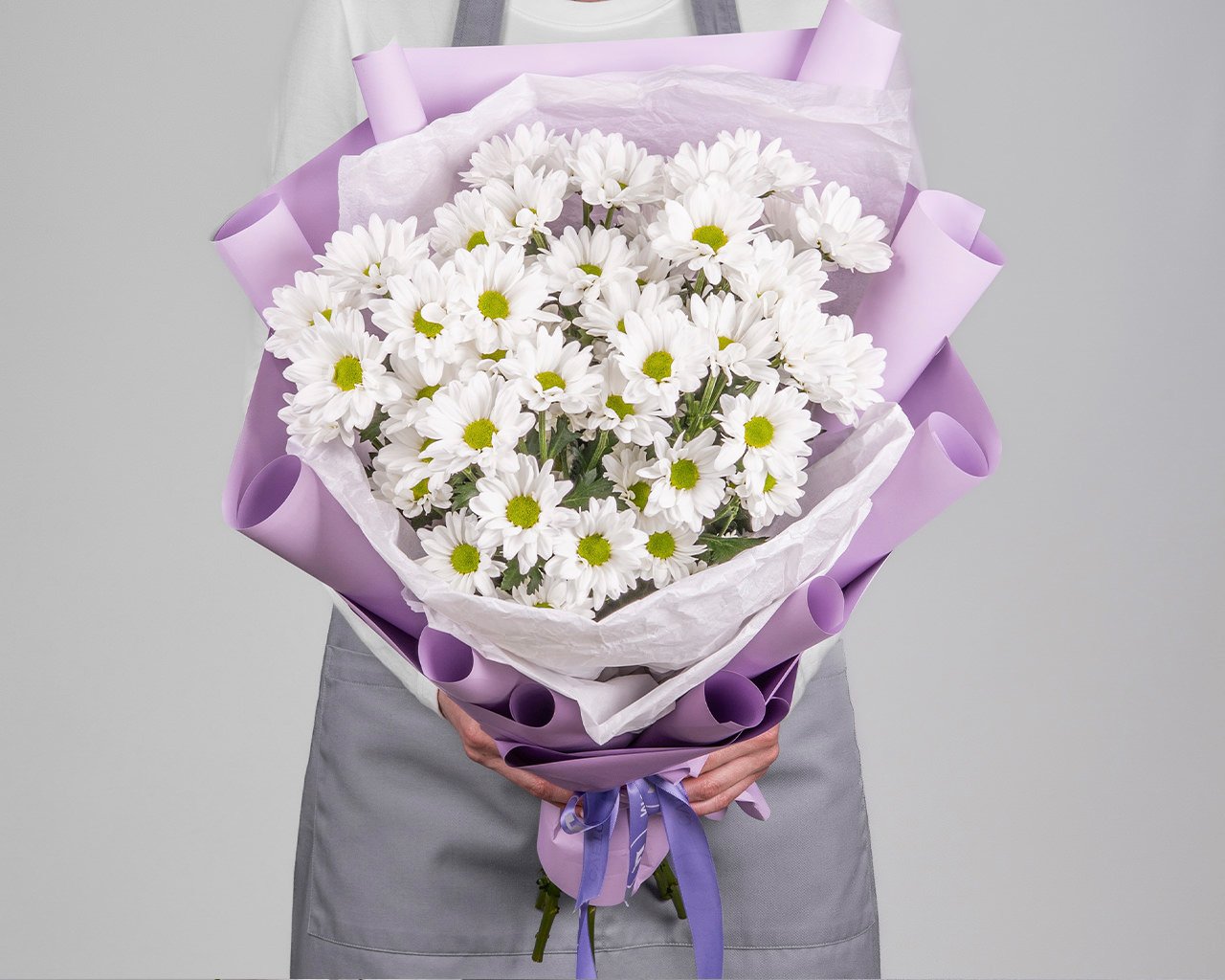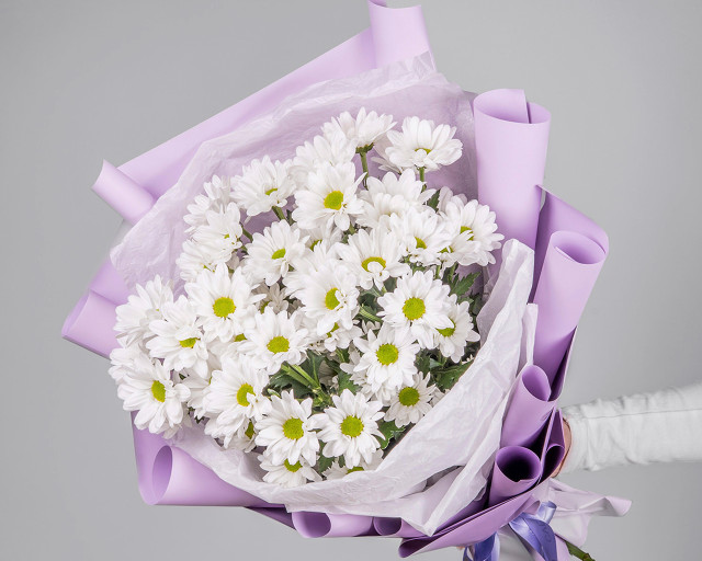 Состав: хризантема кустовая 5 шт, пленка 1,5 шт, лента 1 шт.