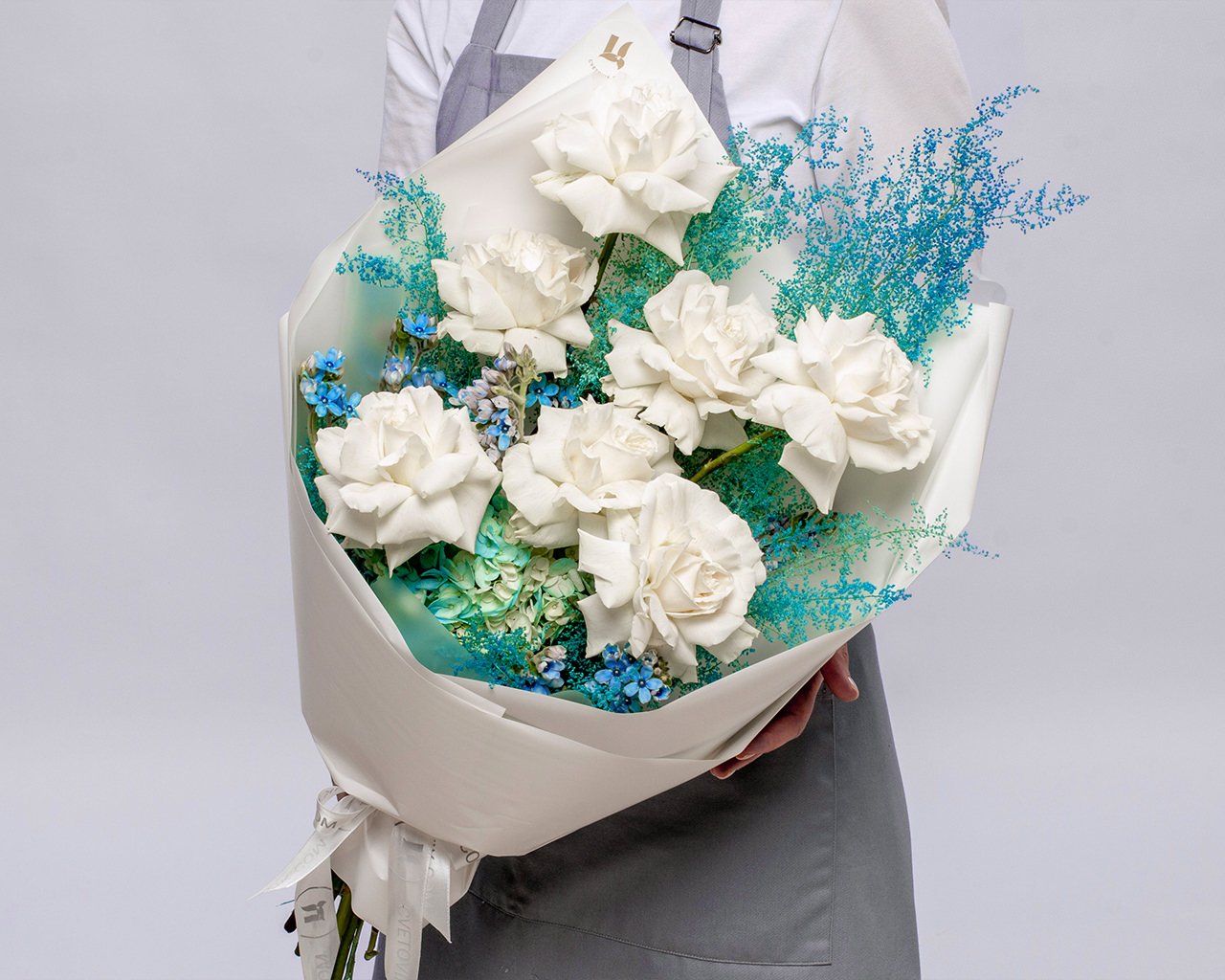 Состав: гортензия 1 шт., роза Премиум 7 шт., твидия 7 шт., стаб.цветы банч 1 шт., пленка 2,5 шт., лента 2 шт.