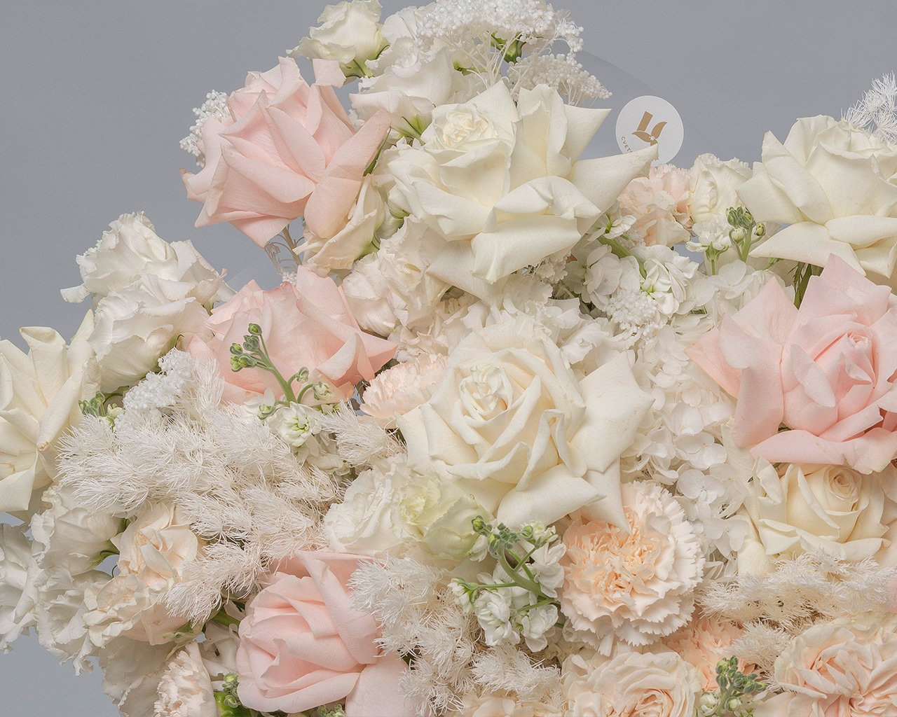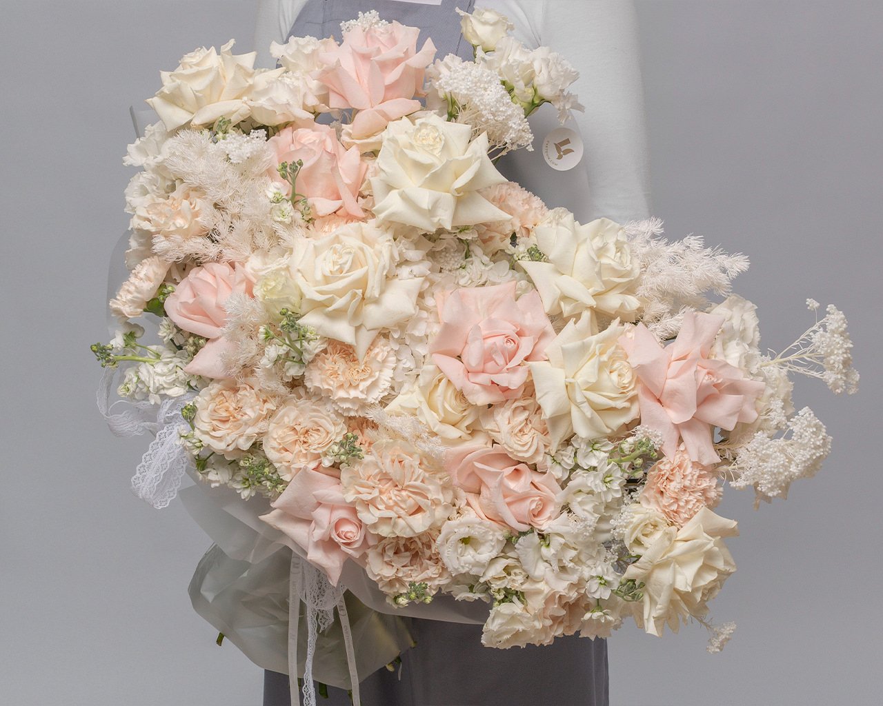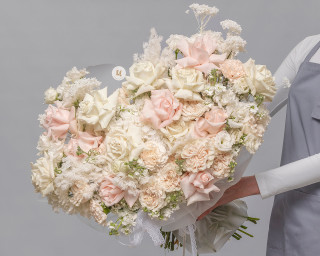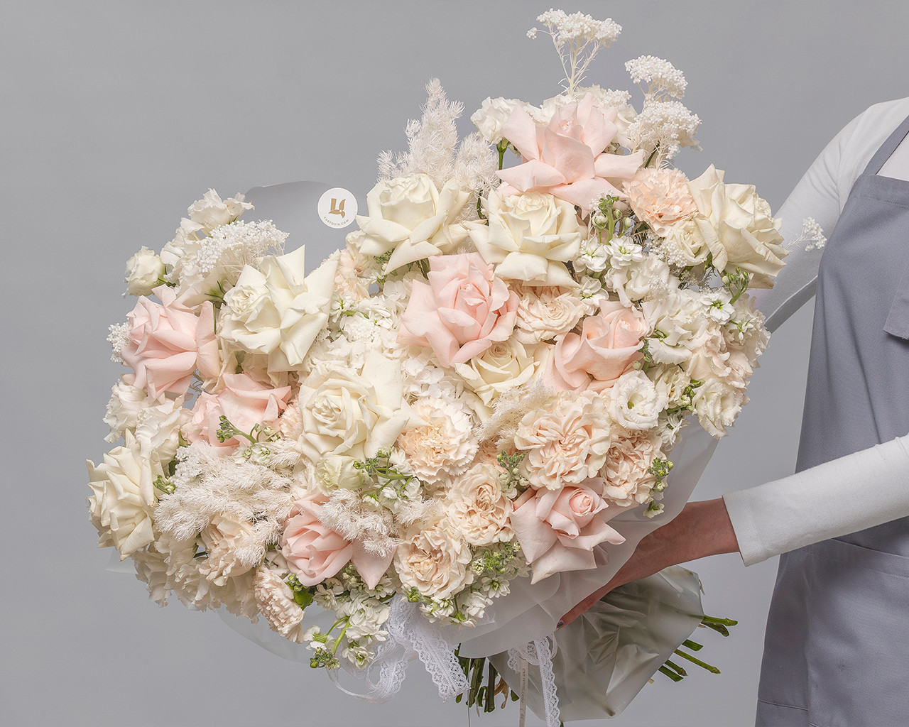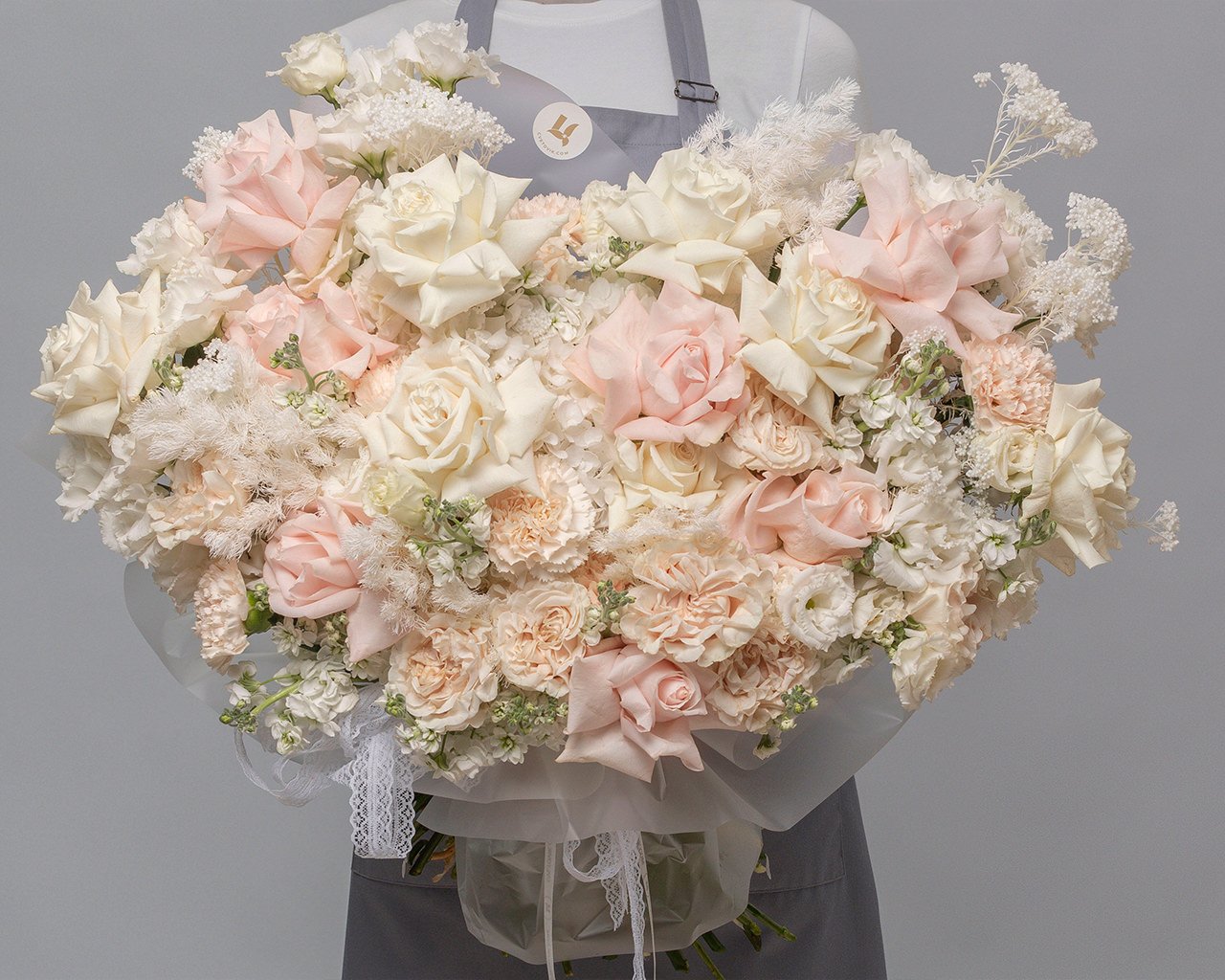 Состав: роза Премиум 40-50 см 21 шт., гвоздика 15 шт., маттиола 15 шт., альстромерия 10 шт., гвоздика куст. 10 шт., садовая роза куст. 10 шт., лизиантус 10 шт., сухоцветы банч 2 шт., пленка 4 шт., лента атласная 2 шт., лента кружевная 2 шт.
