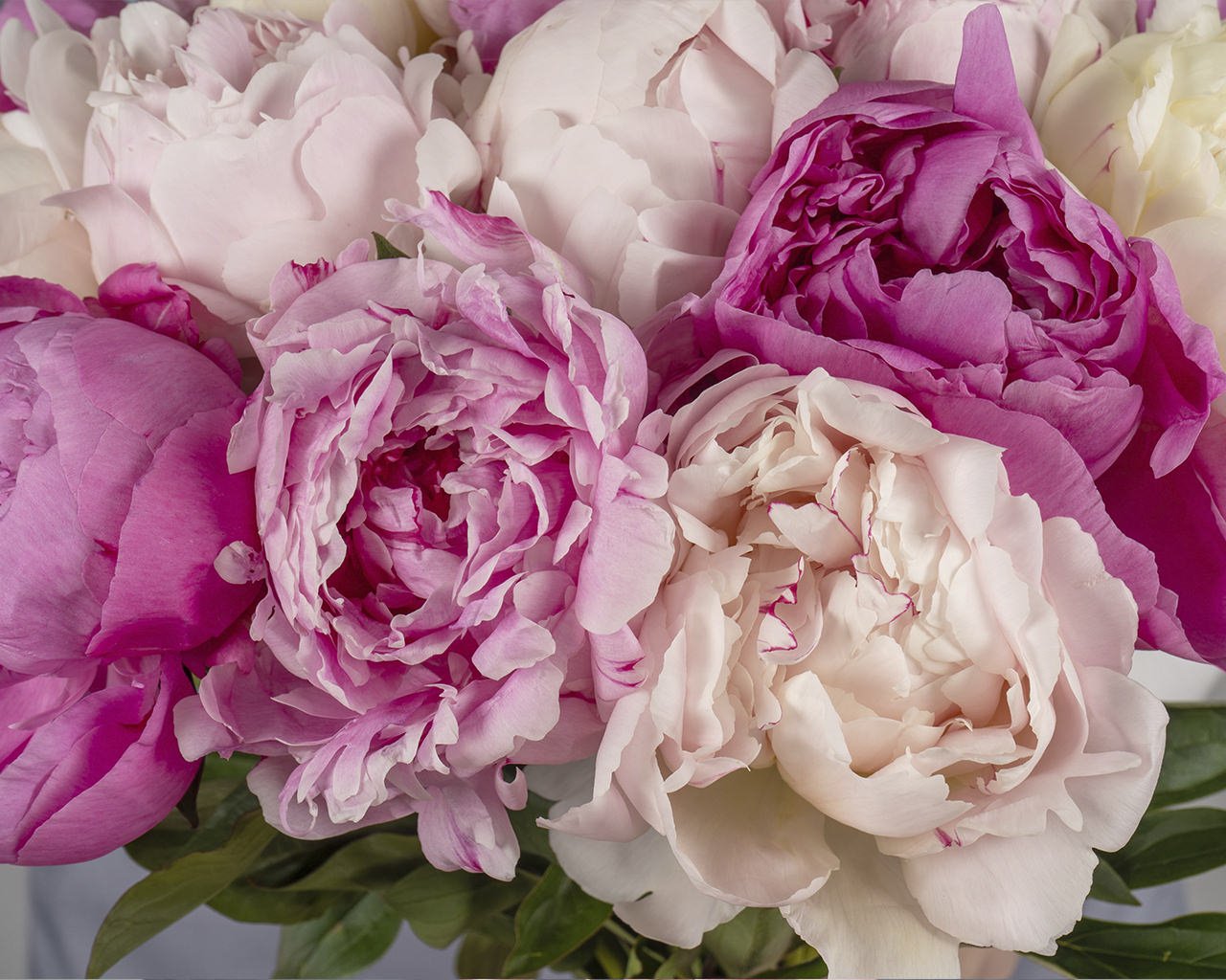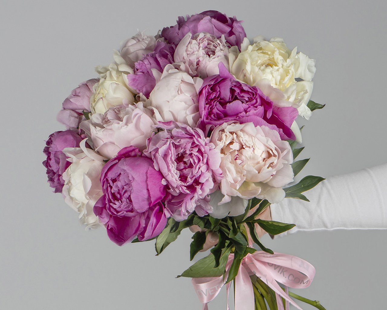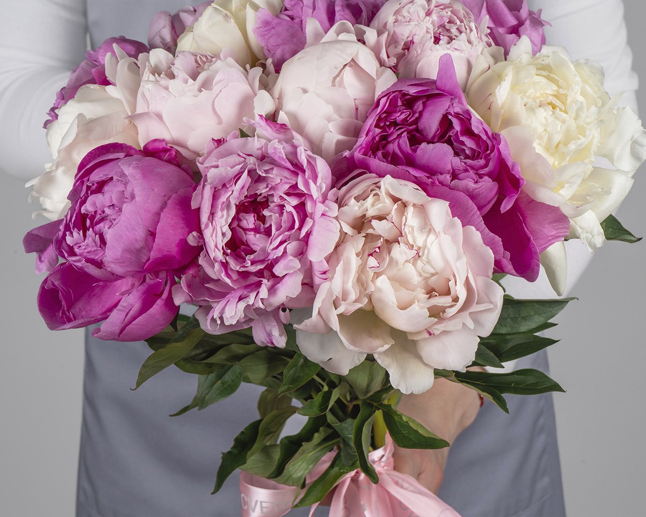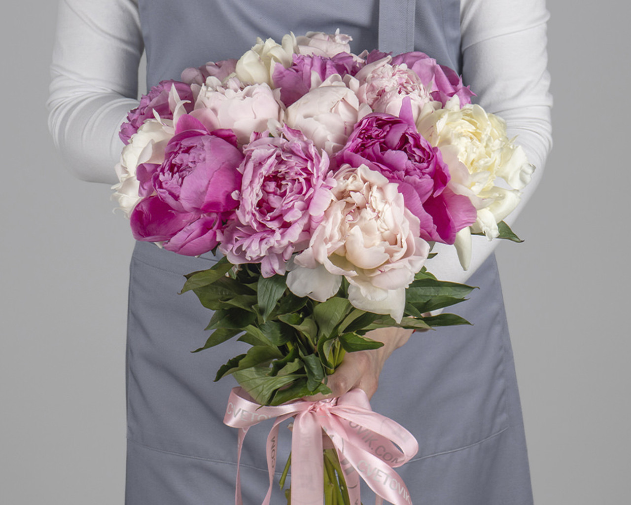 Букет из пионов микс (Сара Бернар) под ленту 15 шт